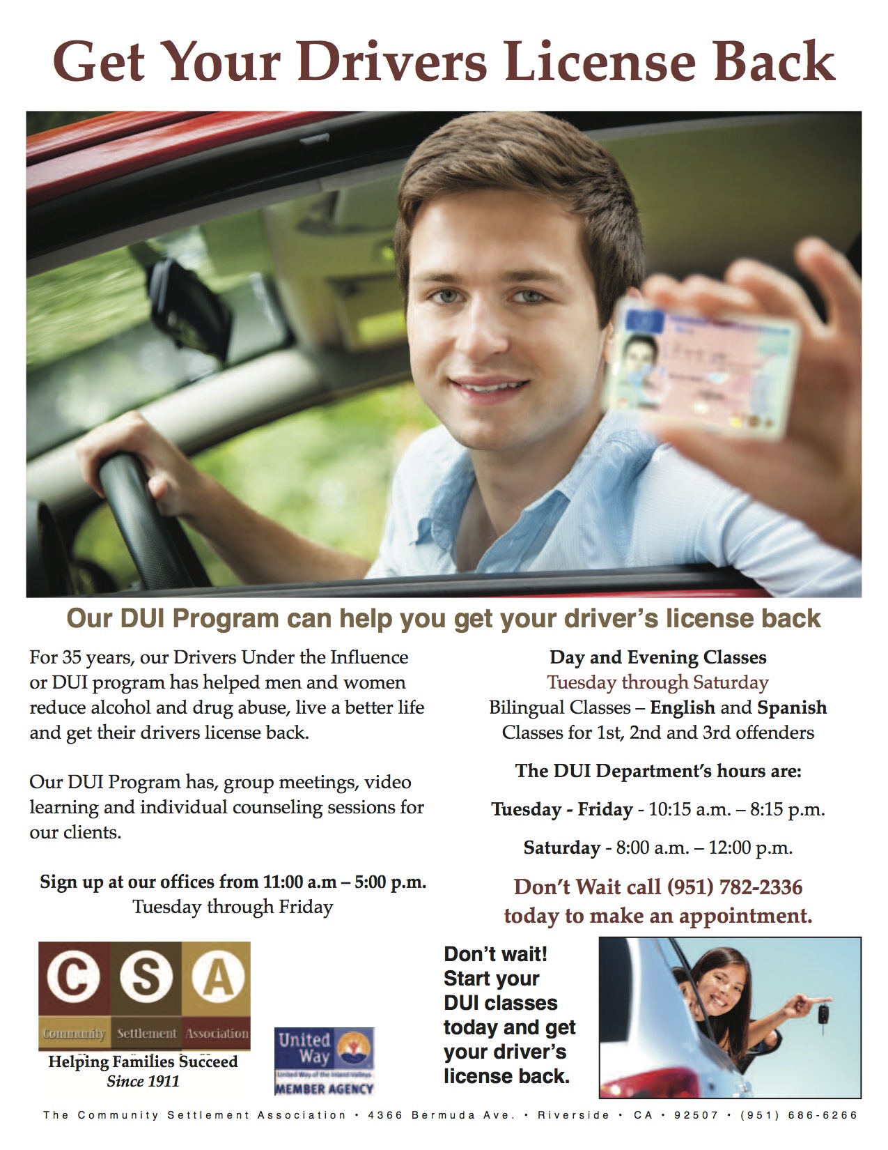 Recruitment flyers and ads for the DUI program at the Community Settlement Association. For more information call Carl Dameron @ 909-534-9500.