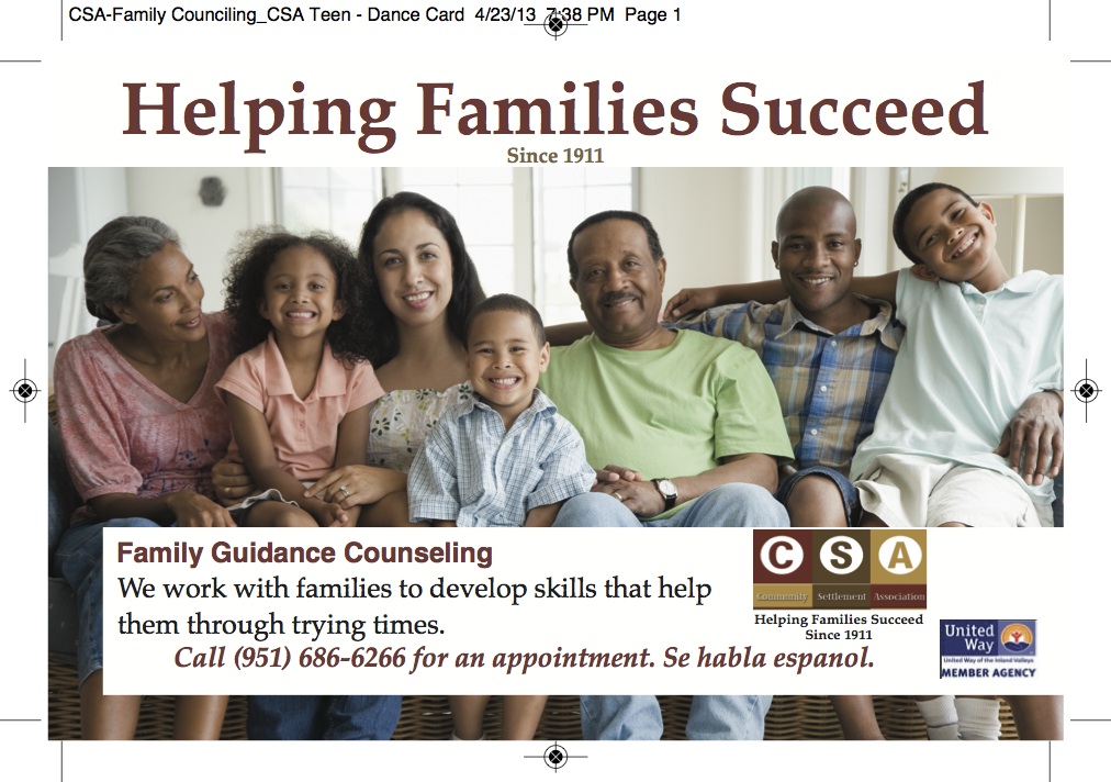 Recruitment flyers and ads for the Family Counseling program at the Community Settlement Association. For more information call Carl Dameron @ 909-534-9500.
