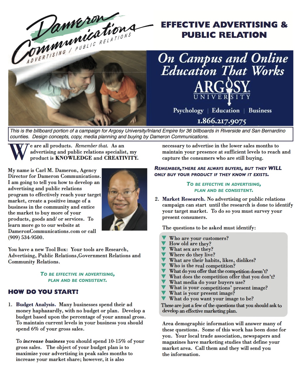 With that in mind, Dameron has published a free brochure, âEffective Advertising & Public Relations.â Itâs not a âpuff pieceâ hyping his own company, not by any means. As he writes, âI am going to tell you how to develop an advertising and public relations program to effectively reach your target market, create a positive image of a business in the community to entice the market to buy more of your products, goods and/or services.â