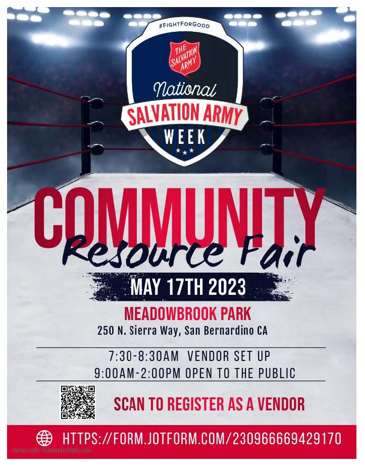 REDLANDS CALIF. Â The Salvation Army San Bernardino Corpsâ âFight for Goodâ features a Community Resource Fair at Meadowbrook Park, 250 N. Sierra Way on Wednesday, May 17th, from 9:00 am to 2:00 pm. Local community service organizations will be on hand offering a wide variety of services to provide support for San Bernardino families in need of help.