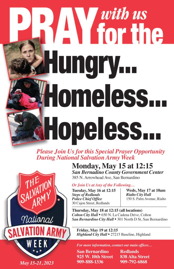 This is one of the local events celebrating National Salvation Army Week, running from May 15th to the 21st. The Salvation Army Corps of San Bernardino will join the National Salvation Army in a week-long series of events to pray for the hungry, homeless, and hopeless and demonstrate the good works it does. This event takes place all over the nation.