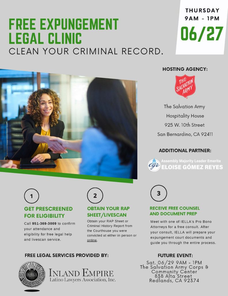 Two dates have been set for those who wish to apply for Expungement: Thursday, June 27th, at The Salvation Army Hospitality House, 925 W. 10th Street in San Bernardino, and Saturday the 29th, at The Salvation Army Corps and Community Center, 838 Alta Street in Redlands. Sessions start promptly at 9:00 a.m. and run until 1:00 p.m.
