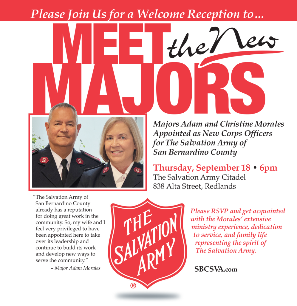 A reception welcoming the majors is set for Thursday, September 18, at The Salvation Army Citadel office at 838 Alta Street, in Redlands, at 6:00 pm. RSVP at: Meet the Majors