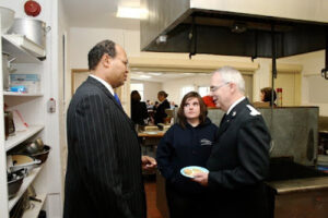 Salvation Army Advisory Board Member Carl Dameron, Salvation Army Band Leader Stephen Yalden and daughter Sophie Yalden, in the kitchen of the…