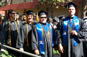 Sal Reyes and Daryl Raymond, front left to right, at their San Bernardino Valley College graduation. The two men obtained help getting…